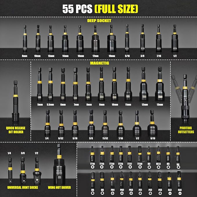The set includes 7 metric deep impact sockets (8mm, 10mm, 13mm, 14mm, 16mm, 17mm, 19mm) and 4 SAE deep sockets (5/16", 3/8", 1/2", 7/16"), with a special 14mm deep nut driver to meet common demands. For everyday fastening, the kit features a complete magnetic nut driver selection – Metric (5mm–13mm) and SAE (1/4"–9/16").