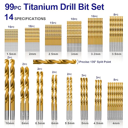 Crafted from premium 4241 high-speed steel, these bits deliver exceptional strength and long-lasting performance. The titanium-coated surface increases hardness, reduces heat buildup, and prevents rust, ensuring a longer lifespan and consistent results. Featuring a 135° split point design, each bit offers quick penetration with less pressure, minimizing walking and making drilling smoother and more accurate.